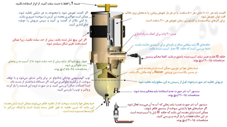 هنگامیکه سوخت وارد سیستم میشود، ذرات جامد بزرگ و قطرات آب که سنگین تر از سوخت هستند، به پایین کاسه جمع آوری می ریزد.